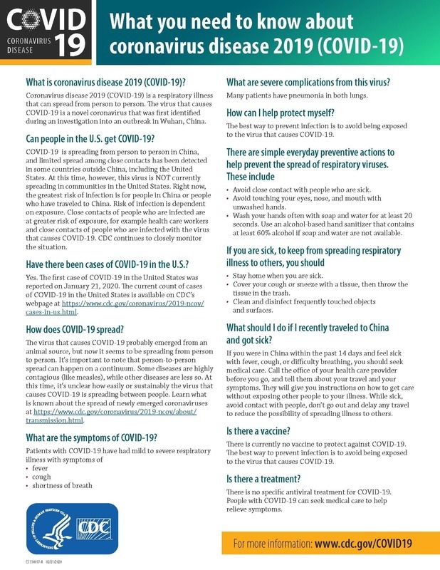 Much is being learned about this new virus. It is believed to be spread through the air when an infected person coughs or sneezes, much in the way the flu and other respiratory viruses are spread. Symptoms can be fever, cough, or difficulty breathing. At this time, persons considered at risk are those who traveled to China, or those in close contact with persons infected with COVID-19.